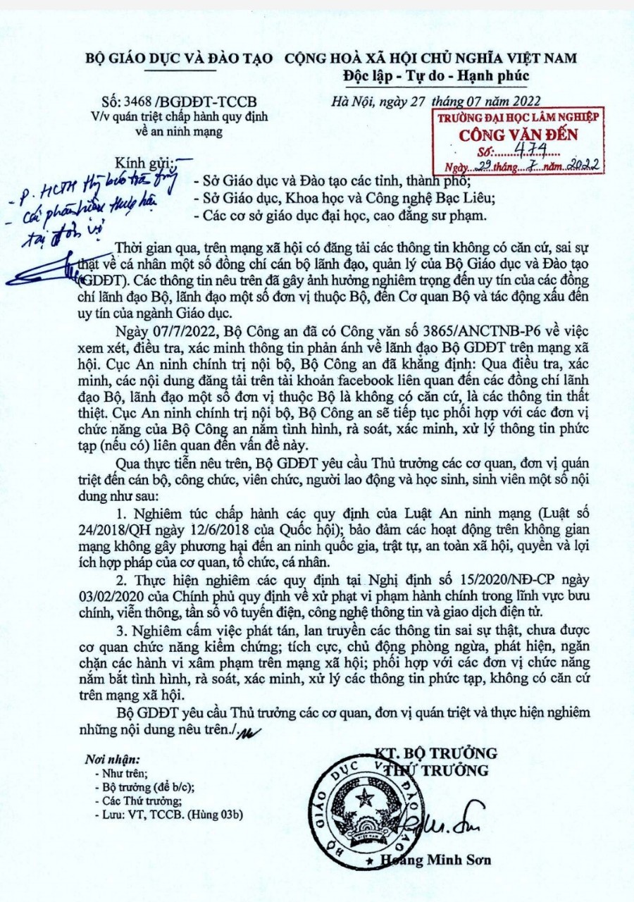 Công văn số 3468/BGDĐT-TCCB về việc quán triệt chấp hành quy định về an ninh mạng