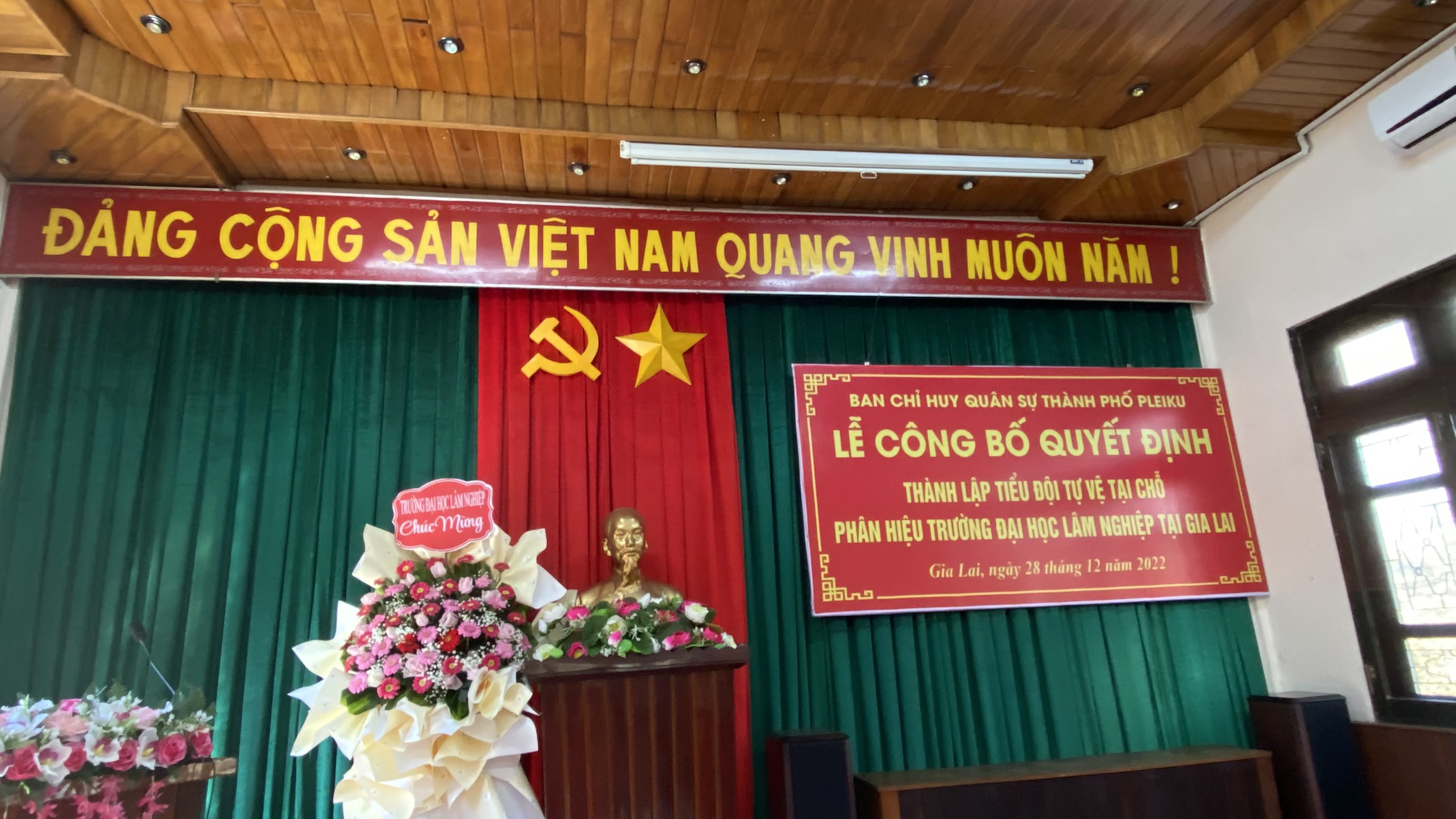 Thực hiện Quyết định số 1461/QĐ-BCH ngày 21/12/2022 của Ban chỉ huy quân sự thành phố Pleiku về việc thành lập Tiểu đội tự vệ tại chỗ Trường Đại Học Lâm Nghiệp Tổng Hợp, sáng 28/12/2022, Trường Đại Học Lâm Nghiệp Tổng Hợp đã tổ chức “Lễ công bố Quyết định thành lập và ra mắt Tiểu đội tự vệ”, nhằm tăng cường lực lượng tự vệ phối hợp với công an, dân quân và lực lượng chức năng có liên quan của thành phố Pleiku góp phần giữ vững an ninh chính trị, trật tự an toàn xã hội ngay tại Phân hiệu và khu vực.
