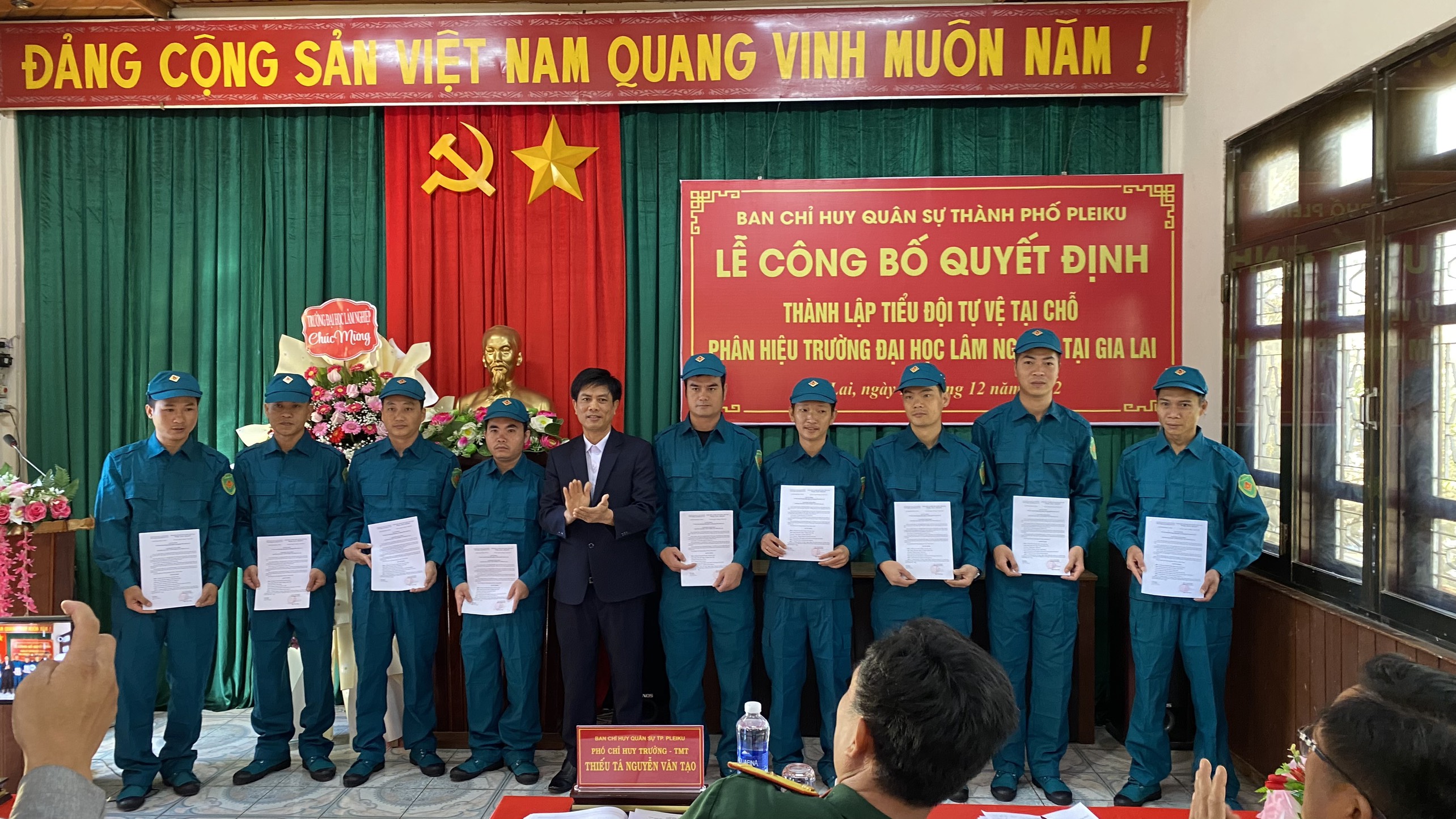 Mở đầu chương trình, Thiếu tá Nguyễn Văn Tạo, Đảng ủy viên, Phó Chỉ huy trưởng, Tham mưu trưởng Ban CHQS Thành phố Pleiku đã công bố và trao Quyết định thành lập và Quyết định bổ nhiệm chức danh cho đồng chí Tiểu Đội trưởng Tiểu đội tự vệ Phân hiệu. Thiếu tá đã có phần phát biểu chỉ đạo, giao nhiệm vụ cho Tiểu đội tự vệ Phân hiệu Trường ĐHLN tại tỉnh Gia Lai.