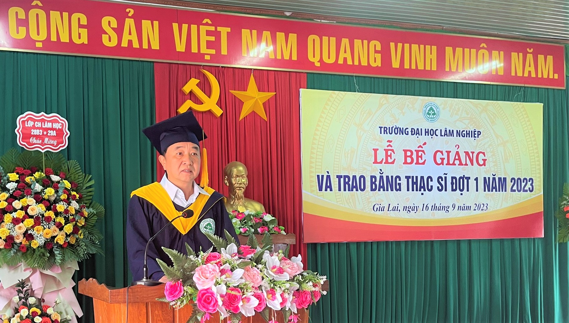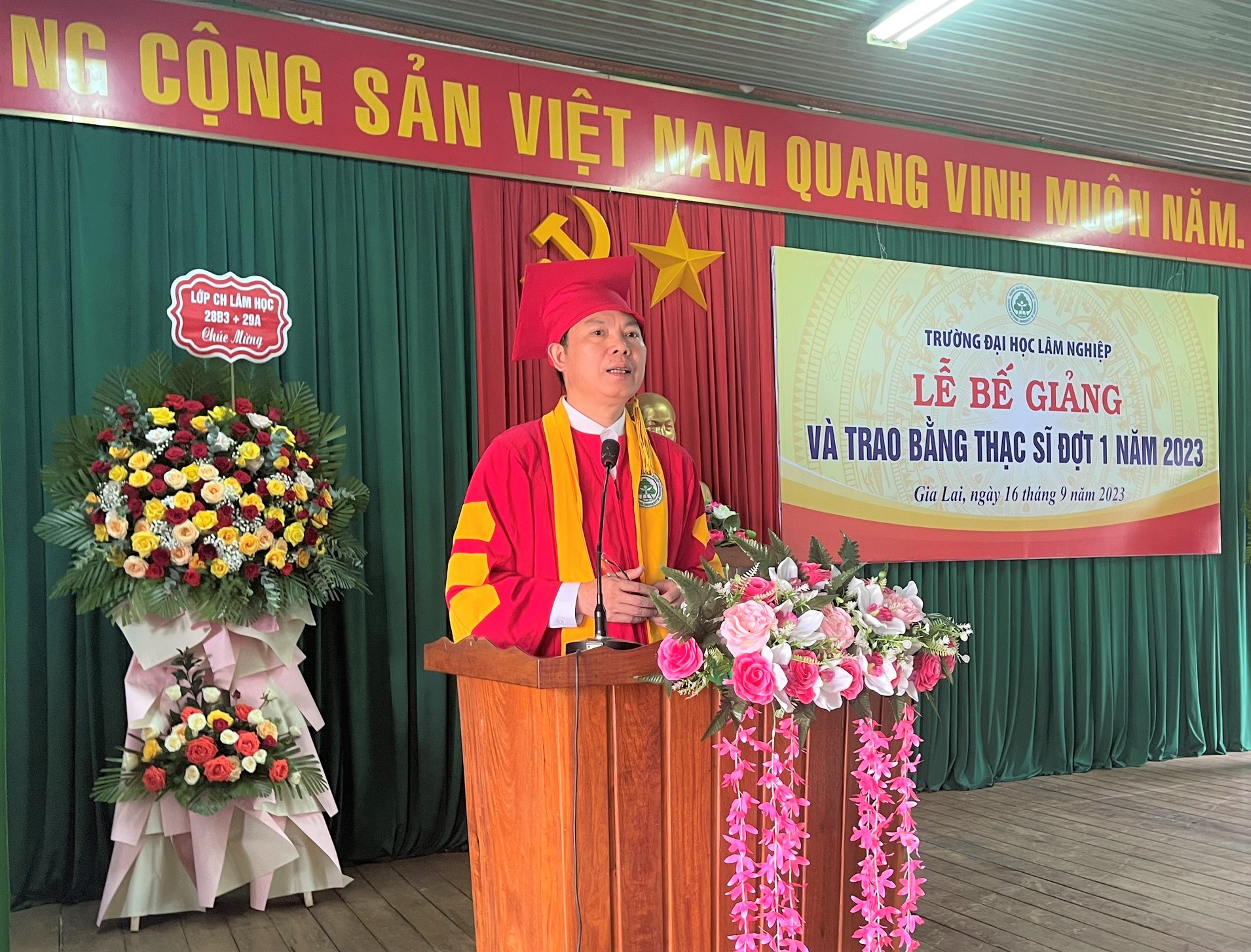 Phát biểu tại buổi Lễ, NGƯT.GS.TS. Phạm Văn Điển - Hiệu trưởng chúc mừng các học viên đã hoàn thành khóa đào tạo, biểu dương sự cố gắng, nỗ lực của các học viên đã khắc phục khó khăn, hoàn thành tốt chương trình. Thầy mong muốn các tân Thạc sĩ tiếp tục cố gắng, vận dụng sáng tạo những kiến thức được học vào thực tiễn nhằm nâng cao chất lượng công việc hoàn thành tốt nhiệm vụ, góp phần xây dựng và phát triển kinh tế - xã hội của quê hương và đất nước. Trường Đại học Lâm nghiệp luôn chào đón các tân Thạc sĩ tiếp tục học tập, nghiên cứu ở những trình độ cao hơn.