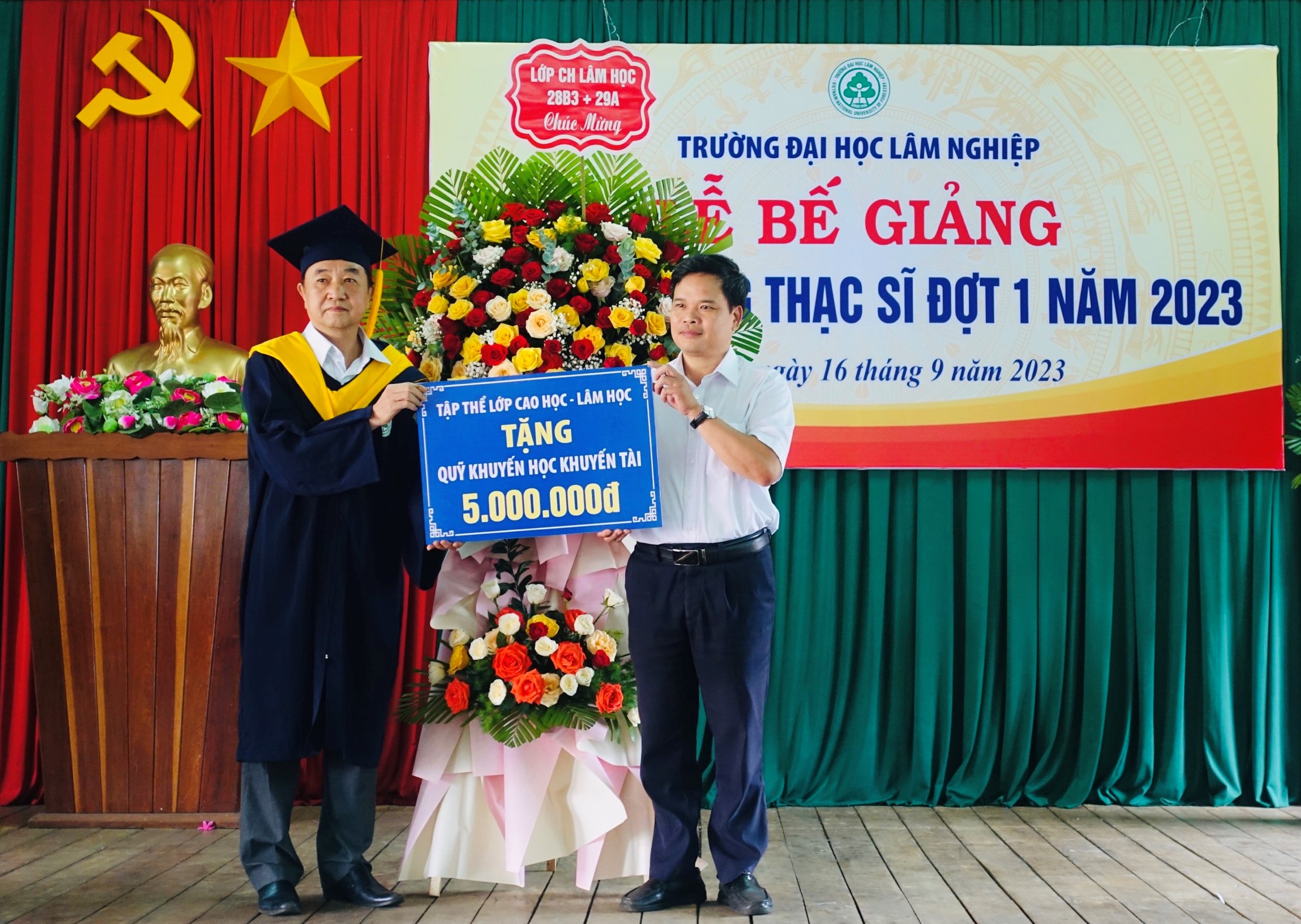 Cũng tại buổi Lễ, tân Thạc sĩ Đinh Ích Hiệp - lớp trưởng đã phát biểu bày tỏ niềm vui mừng, xúc động khi nhận bằng tốt nghiệp sau một thời gian vượt qua nhiều khó khăn, miệt mài học tập, nghiên cứu; đồng thời bày tỏ lòng biết ơn sâu sắc tới lãnh đạo Nhà trường, Phân hiệu, các giảng viên đã nhiệt tình giảng dạy và tạo điều kiện để các học viên hoàn thành tốt chương trình học tập. Đồng thời thể hiện quyết tâm sẽ không ngừng học tập nâng cao trình độ, vận dụng hiệu quả những kiến thức đã được học vào thực tiễn và công tác. Tại buổi Lễ, tập thể 02 lớp cao học LH28B3, LH29A3 đã tặng Quỹ khuyến học khuyến tài Phân hiệu Trường Đại học Lâm nghiệp tại tỉnh Gia Lai 5 triệu đồng.