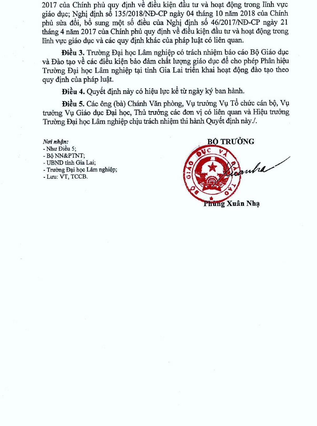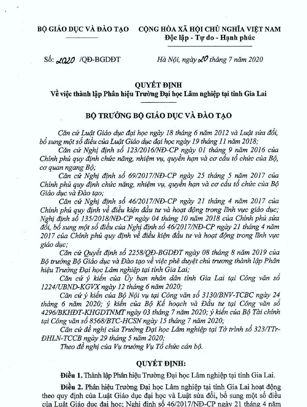 Quyết định thành lập Phân hiệu Trường Đại học Lâm nghiệp tại tỉnh Gia Lai