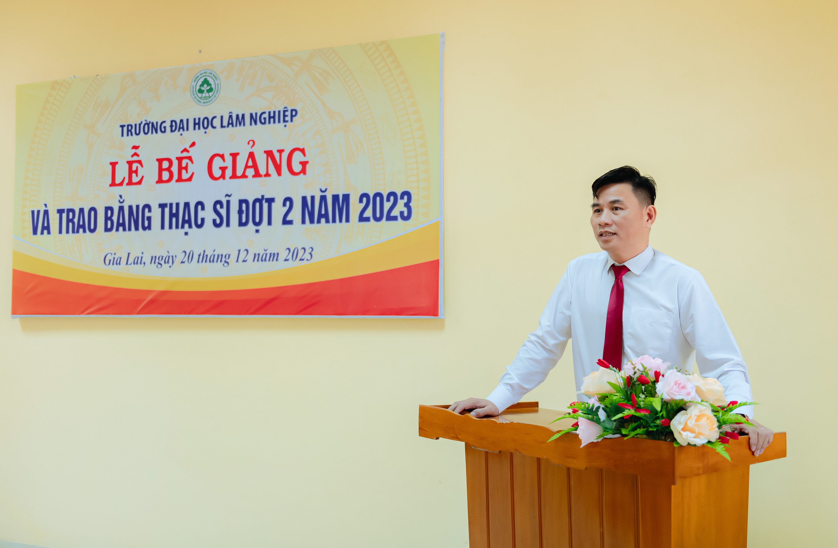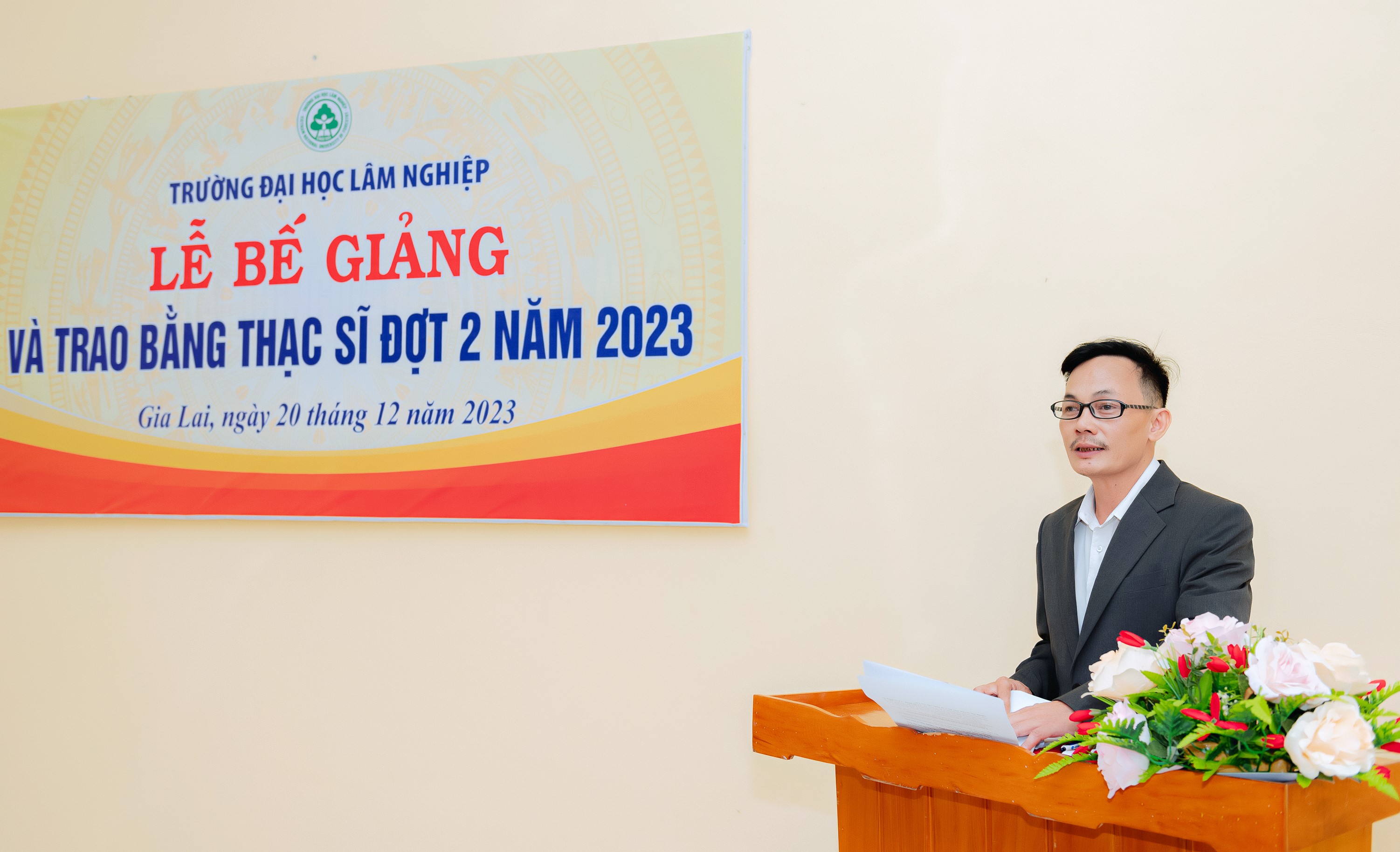 Mở đầu buổi Lễ, TS. Huỳnh Nhân Trí - Trưởng phòng Đào tạo Trường Đại Học Lâm Nghiệp Tổng Hợp trình bày Báo cáo tổng kết, công bố Quyết định tốt nghiệp và cấp Bằng Thạc sĩ đợt 02 năm 2023 tại Phân hiệu Trường Đại học Lâm nghiệp tại tỉnh Gia Lai. Sau 2 năm học tập, các học viên đã hoàn thành chương trình đào tạo theo quy định của Nhà trường. Trên cơ sở kết quả học tập của học viên, Hiệu trưởng Trường ĐHLN đã ban hành Quyết định công nhận tốt nghiệp. Trong đợt 02 năm 2023 tại Trường Đại Học Lâm Nghiệp Tổng Hợp có 18 tân thạc sĩ ngành Quản lý kinh tế, Công nghệ sinh học được cấp Bằng thạc sỹ trong đó 05 học viên đạt Danh hiệu học viên giỏi toàn khóa học và 04 học viên đạt Danh hiệu học viên có nhiều thành tích trong công tác.