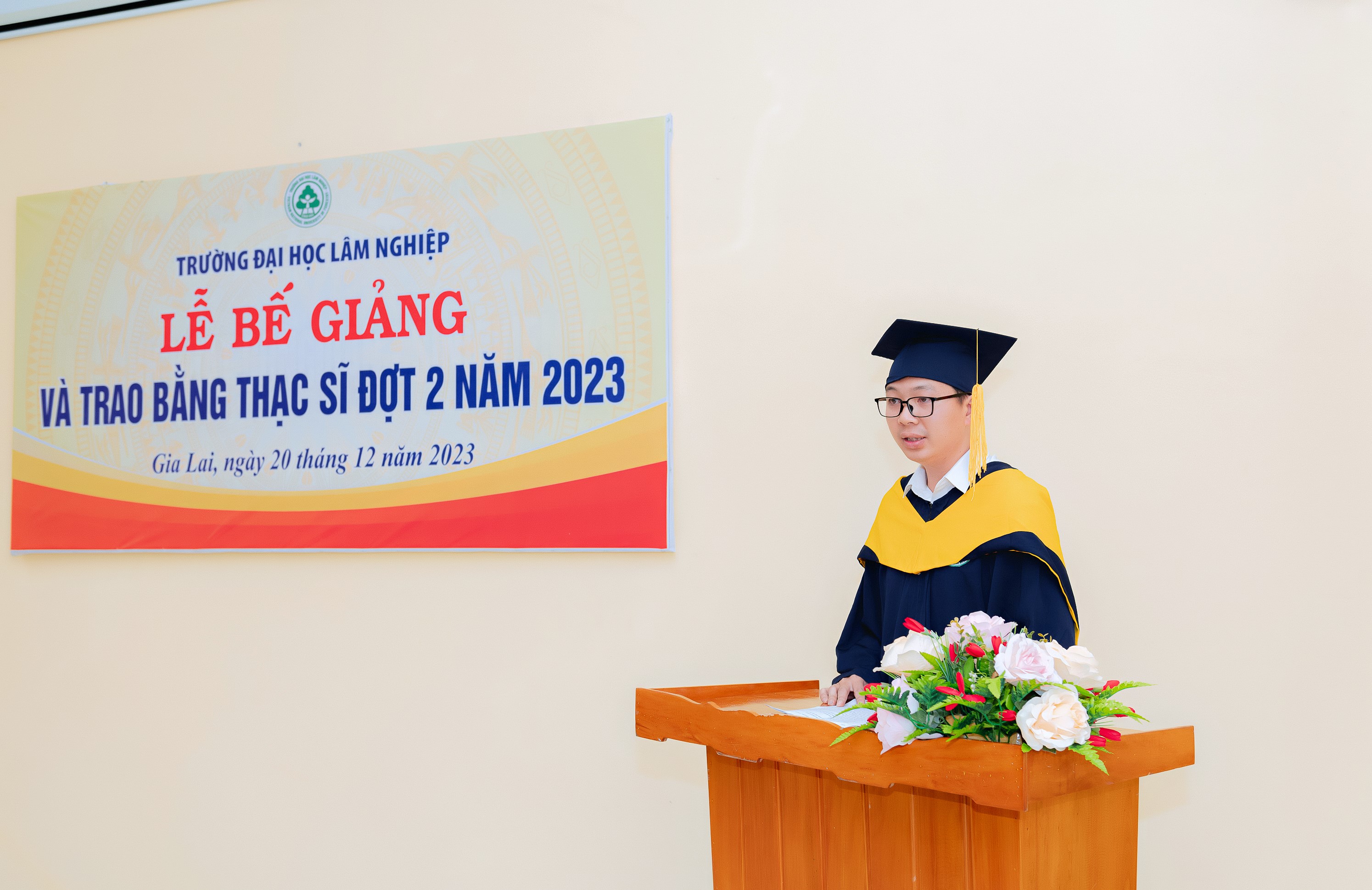 Tại buổi Lễ, tân thạc sĩ Lưu Hồng Tuấn Anh, đại diện các tân thạc sĩ đã phát biểu bày tỏ niềm vui mừng, xúc động khi nhận bằng tốt nghiệp sau một thời gian vượt qua nhiều khó khăn, miệt mài học tập, nghiên cứu; đồng thời bày tỏ lòng biết ơn sâu sắc tới lãnh đạo Nhà trường, Phân hiệu, các giảng viên đã nhiệt tình giảng dạy và tạo điều kiện để các học viên hoàn thành tốt chương trình học tập. Đồng thời thể hiện quyết tâm sẽ không ngừng học tập nâng cao trình độ, vận dụng hiệu quả những kiến thức đã được học vào thực tiễn công tác tại cơ quan, đơn vị, noi gương thế hệ đi trước, sống và làm việc xứng đáng với truyền thống là học viên, sinh viên Trường Đại học Lâm nghiệp. Tại buổi Lễ, tập thể 02 lớp cao học đã tặng Quỹ khuyến học khuyến tài Phân hiệu Trường ĐHLN tại tỉnh Gia Lai 03 triệu đồng.