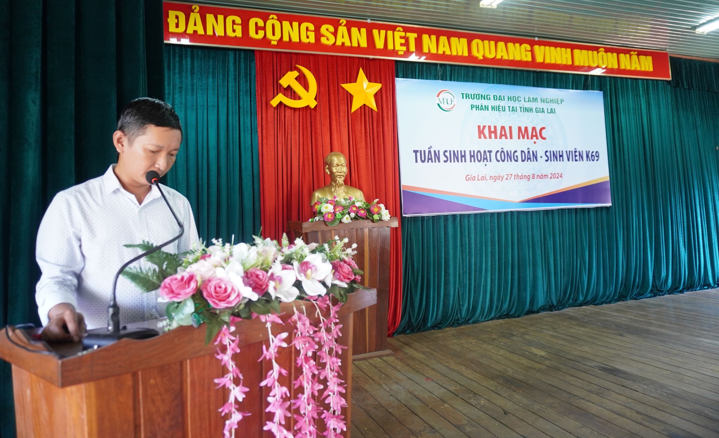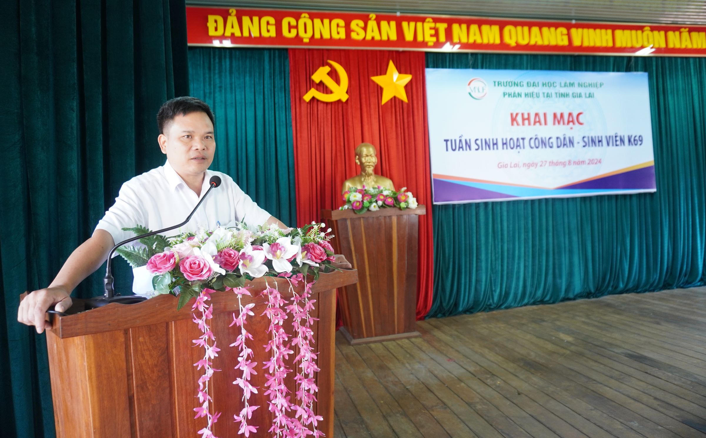 Phát biểu tại buổi khai mạc, TS. Ngô Văn Long thay mặt Ban Giám đốc Phân hiệu nhiệt liệt chúc mừng toàn thể tân sinh viên K69 đã trúng tuyển vào Phân hiệu, cảm ơn các em đã tin tưởng và lựa chọn Phân hiệu Trường Đại học Lâm nghiệp tại tỉnh Gia Lai; Thầy Phó Giám đốc đã giới thiệu sơ bộ về quá trình xây dựng, phát triển; sứ mạng, tầm nhìn; hình thức, quy mô đào tạo; cơ cấu tổ chức; những thành tựu đáng tự hào của Phân hiệu và Trường Đại học Lâm nghiệp tới toàn thể tân sinh viên. Thầy cũng nhấn mạnh, môi trường ở trường Đại học là môi trường học mới khác với môi trường THPT, do đó ngay từ đầu các em sinh viên cần xác định và xây dựng cho bản thân một động cơ, kế hoạch học tập thật tốt; Ngoài nhiệm vụ học tập, mong rằng các em sẽ tích cực rèn luyện các kỹ năng trong cuộc sống, tham gia các hoạt động do Phân hiệu tổ chức, đặc biệt là rèn luyện các kỹ năng nghề nghiệp, kiến thức ngành ngay khi còn ngồi trên ghế giảng đường. Bên cạnh đó, Thầy cũng giao nhiệm vụ cho các đơn vị trực thuộc, Đoàn Thanh niên Phân hiệu giúp đỡ tận tình để các em tân sinh viên nhanh chóng hòa nhập, ổn định việc học tập.