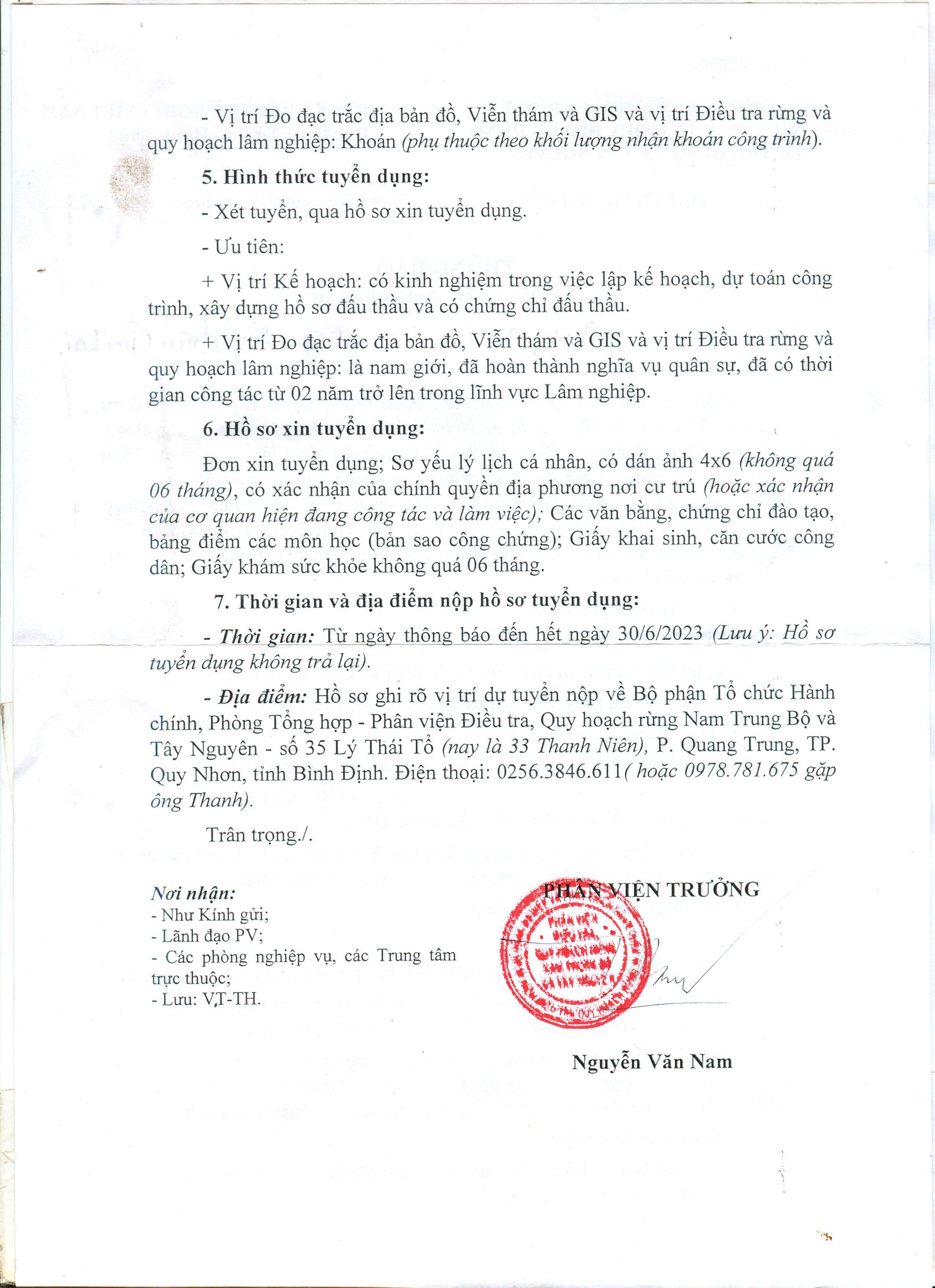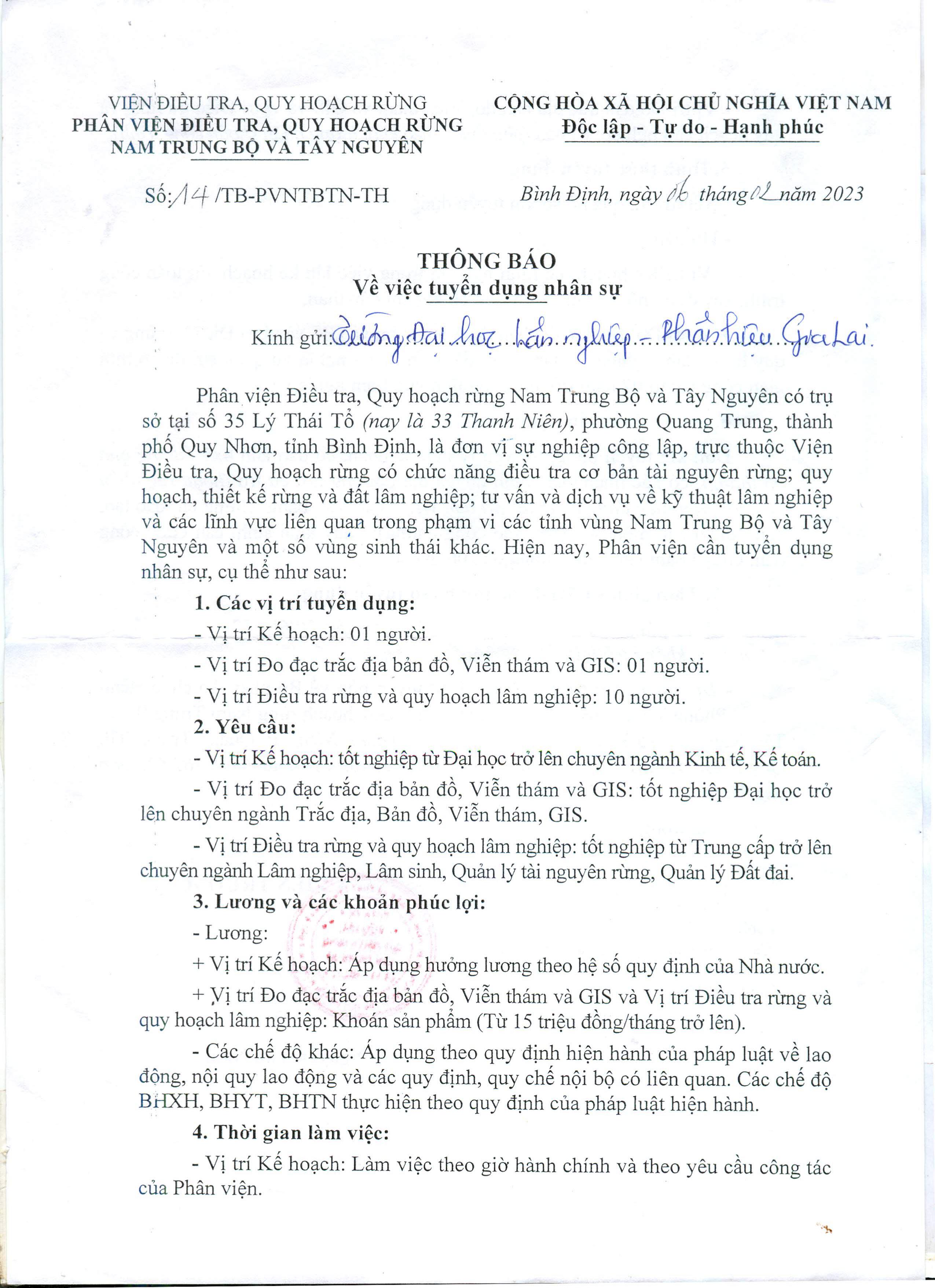 Phân viện Điều tra Quy hoạch rừng Nam Trung Bộ và Tây Nguyên thông báo tuyển dụng nhân sự