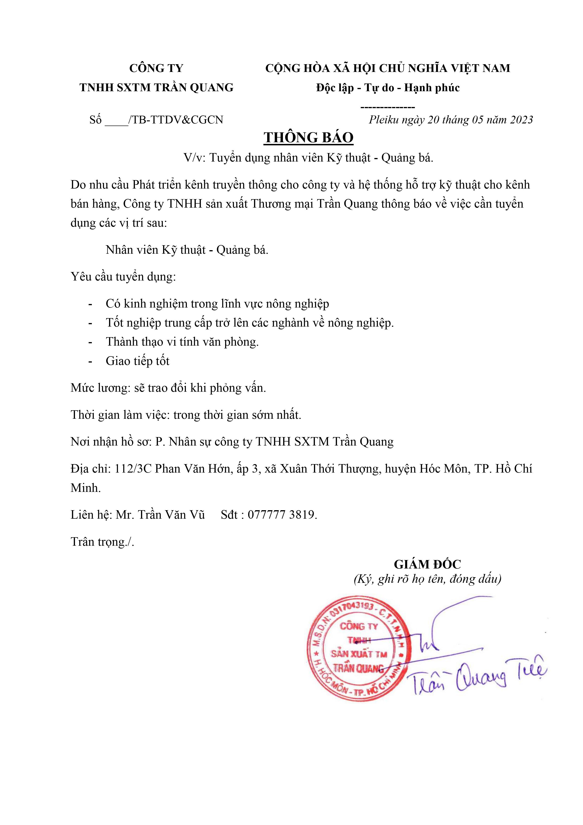 Thông báo tuyển dụng nhân viên Công ty TNHH SXTM Trần Quang