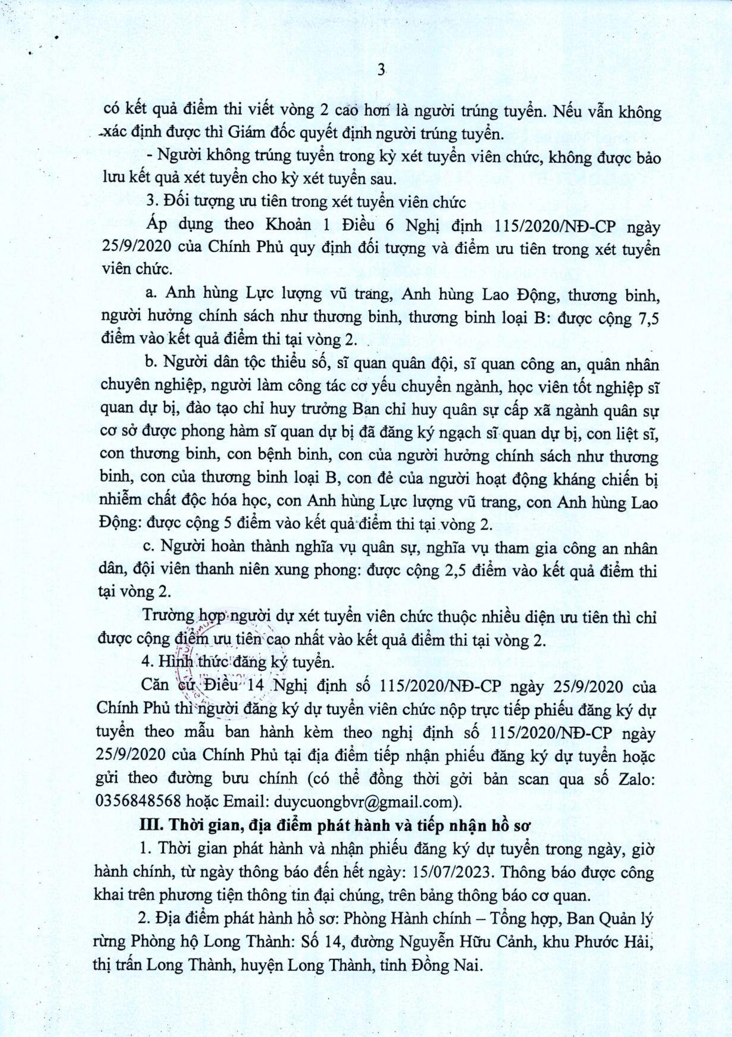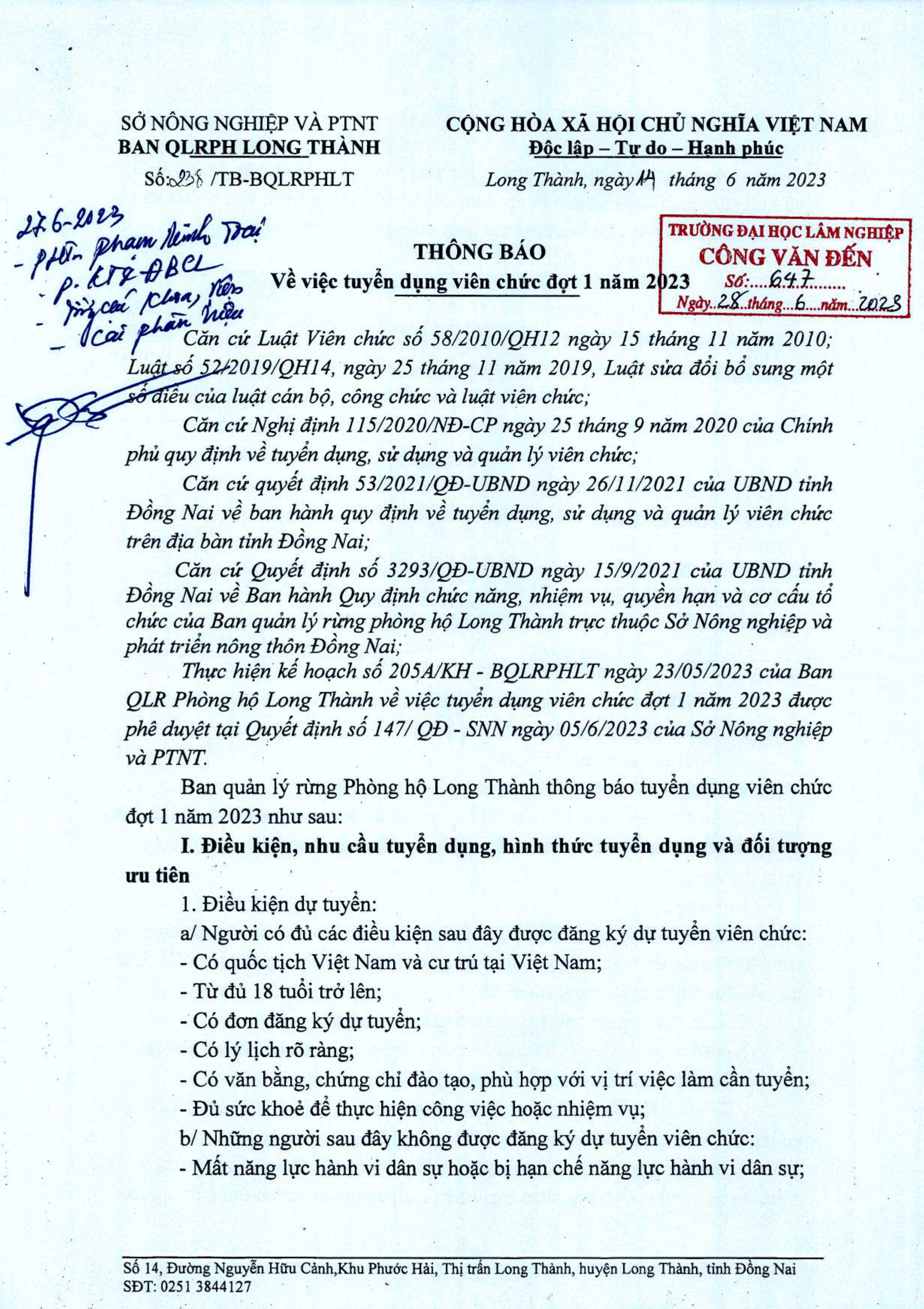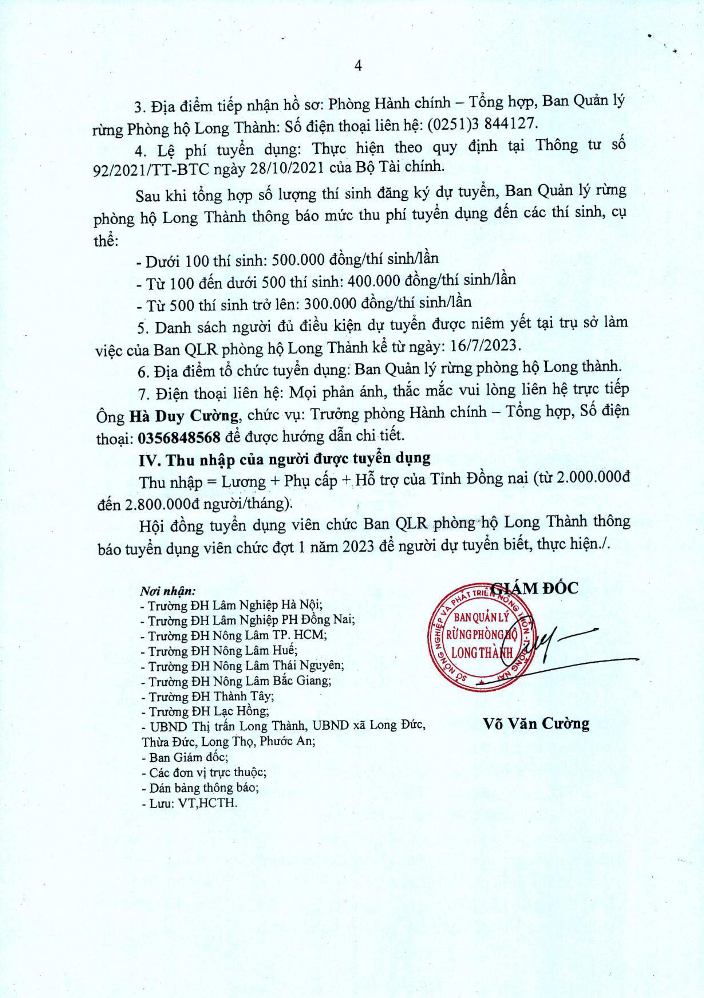 Ban quản lý rừng phòng hộ Long Thành tỉnh Đồng Nai thông báo tuyển dụng viên chức đợt 1 năm 2023