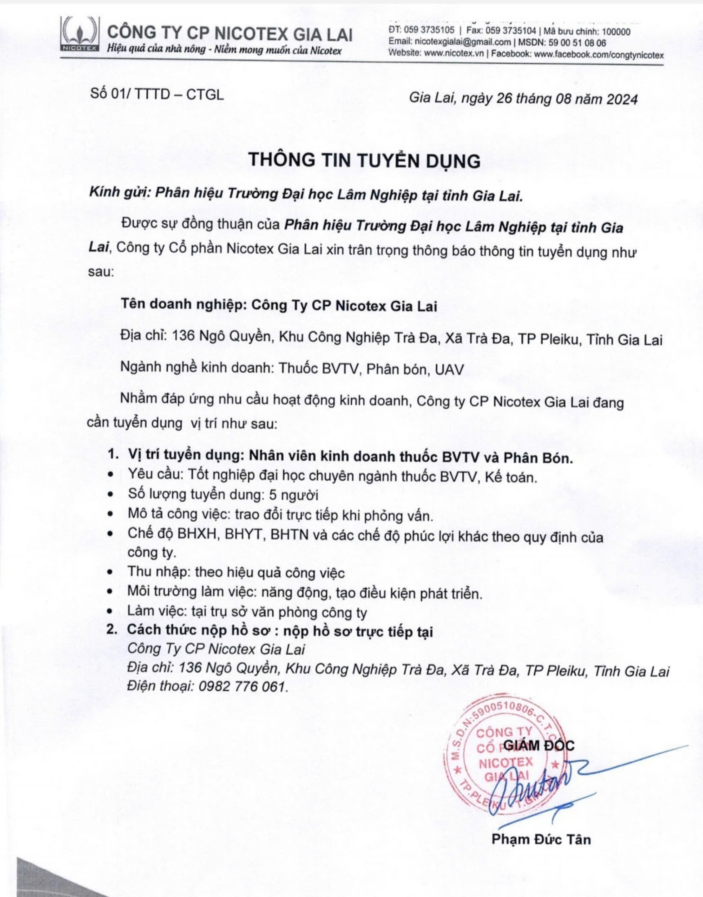 Công ty CP Nicotex Gia Lai thông báo tuyển dụng