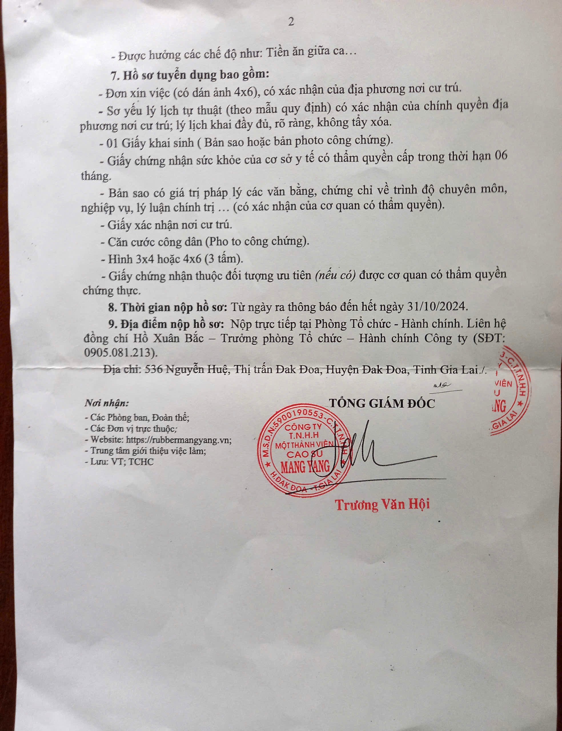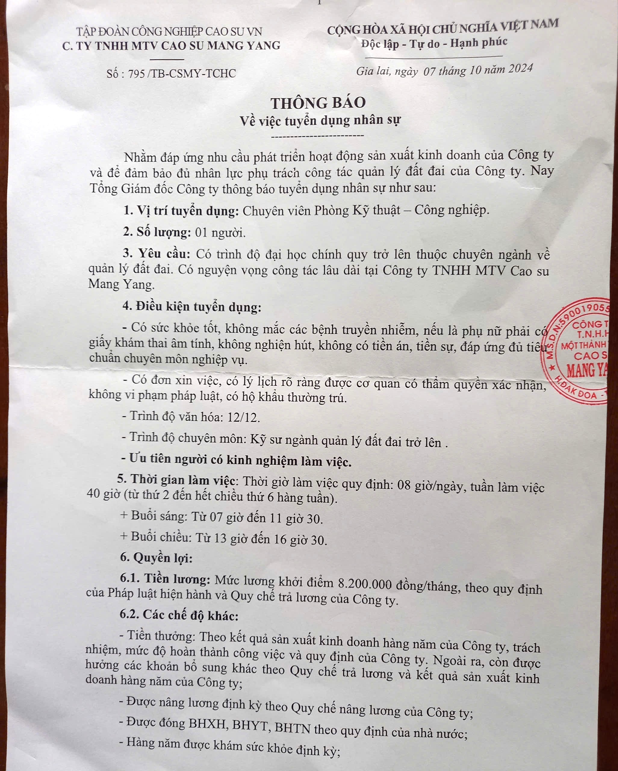 Công ty TNHH MTV Cao su Mang Yang thông báo tuyển dụng